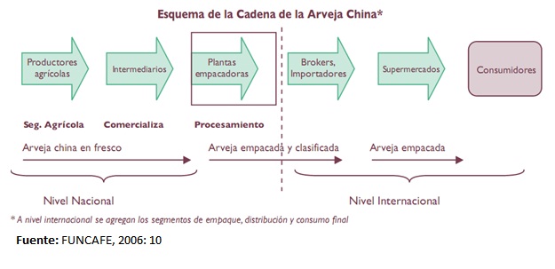 La cadena de arveja china en Guatemala está conformada por tres segmentos: el agrícola, el de procesamiento o empaque y el de comercialización, en el que la cadena de intermediarios juega un papel muy importante sobre todo en la fijación de precios. (FUNCAFE, 2006: 8)
