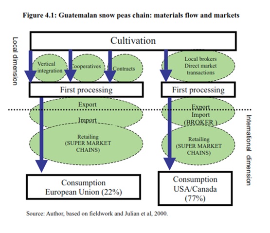La cadena de arveja china guatemalteca es un buen ejemplo de una cadena corta. Las características de producto al consumirlo son muy parecidas a la forma de la materia prima, pues nada más implica un poco de transformación en la cadena. En este caso, las prácticas de manejo de cosecha adquieren gran relevancia. El agente local clave es el agro-procesador/empacador/exportador. Como en el caso de todas las cadenas de frutas y vegetales, las posibilidades para diferenciación de producto por parte de los agentes locales (cultivadores y empaquetadores de primera) en la arveja china están limitados, lo que implica que los compradores internacionales usualmente no requieren características particulares del producto.