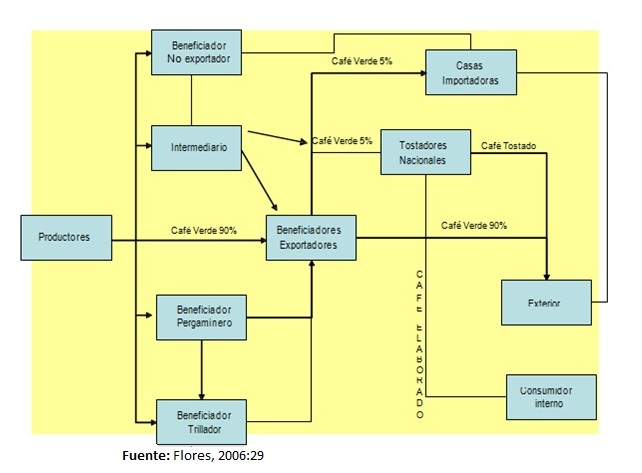 La parte de la cadena global que se realiza dentro de las fronteras geográficas del país, comprende la producción agrícola, el beneficiado y la exportación. La producción agrícola consiste básicamente en el cultivo y recolección del fruto, luego comienza la fase del beneficiado, que se fundamenta en la aplicación de una primera etapa de un proceso industrial. El siguiente eslabón, lo conforma la fase de exportación que conecta la cadena interna con el exterior. La cadena global la complementan los eslabones superiores como son la distribución y el consumo del café, dichos procesos se llevan en países renta alta. (Flores, 2006:4)