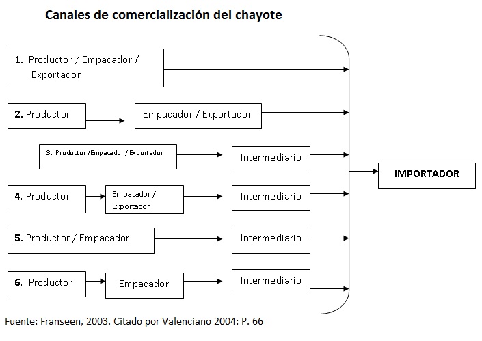 La cadena del chayote de Costa Rica está orientada por la demanda, ya que es intensiva en trabajo en tierra y trabajo, y su proceso productivo no requiere de tecnología sofisticada; por otra parte existe una gran cantidad de productores los cuales no necesitan de grandes cantidades de capital para empezar a producir. Por último existen una gran cantidad de minoristas entre supermercados y tiendas de verduras. (Valenciano, 2004: P.63)