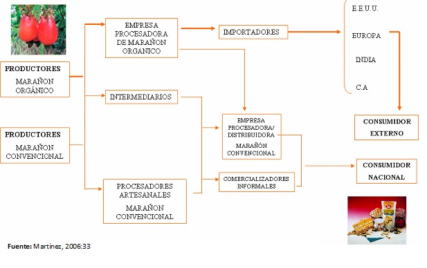 En la cadena de marañón para el caso de El Salvador se presentan dos opciones tecnológicas: Marañón Orgánico y Marañón Convencional. Estas opciones se definieron así, en función del grado de coordinación horizontal y vertical que existe entre los actores involucrados en la cadena, el tipo de procesamiento de las nueces y los mercados de consumo final. Las nueces orgánicas se dirigen hacia mercados especializados, en los cuales, el consumidor está dispuesto a pagar un premio si se garantiza el cumplimiento de ciertos estándares sociales y ambientales en toda la cadena. (Martínez, 2006:5)