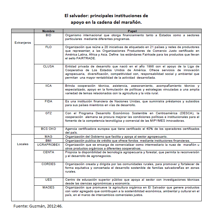 Por su parte, la producción de marañón orgánico es la que predomina localmente debido al dinamismo de la actividad en los mercados internacionales, por lo cual los productores se han orientado a vender al mercado externo. (Guzmán, 2012:30). En El Salvador se está generando una gran variedad de productos agrícolas orgánicos para exportación incluido el marañón. Existen 384 fincas dedicadas a la producción primaria de productos orgánicos, en las cuales actualmente hay en producción 8.304 manzanas (Barrera, 2008), incluidas dentro de ellas las 2.115 manzanas de marañón orgánico. (Guzmán, 2012:30). En la siguiente imagen se hace una representación gráfica de lo que es la cadena de valor del marañón orgánico.