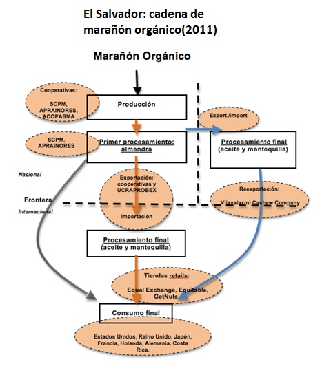 Respecto a la cadena orgánica de marañón, las etapas de comercialización/distribución y consumo se realizan fuera de las fronteras salvadoreñas, caracterizadas porque los importadores de la nuez obtienen subproductos de marañón con lo cual agregan valor a las actividades hasta venderlo al consumidor final, de manera que los países productores abastecen de materia prima a los importadores. (Guzmán, 2012:39)