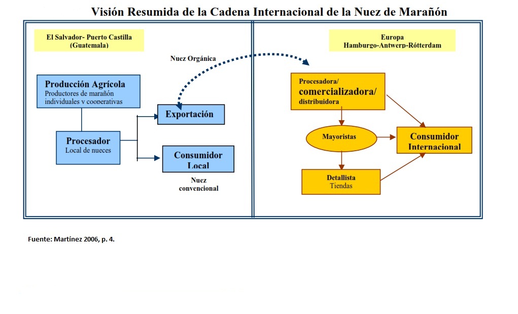 Los eslabones más bajos de la cadena conformados por la producción agrícola, procesamiento y exportación se desarrollan en países de renta media a baja, que poseen condiciones agro ecológicas favorables para el desarrollo del cultivo y la infraestructura instalada básica para llevar acabo una primera fase del procesamiento,empaque y exportación de las nueces hacia su destino final. Las nueces de marañón que son exportadas no constituyen un producto terminado, ya que continúan una segunda etapa de transformación más avanzada en los países consumidores, donde las semillas pueden sufrir cambios de unidad, de empaque y de presentación para su consumo final. (Martínez, 2006. p. 4)