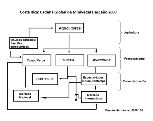 La estructura de los Minivegetales costarricenses está compuesta pro 4 segmentos: cultivo, procesamiento y empaque, exportación /importación y la distribución final. Los principales actores de esta cadena son principalmente pequeños y medianos productores en la fase de cultivo. (Díaz, 2003: P. 196).